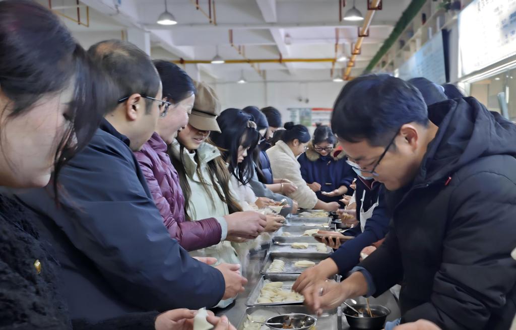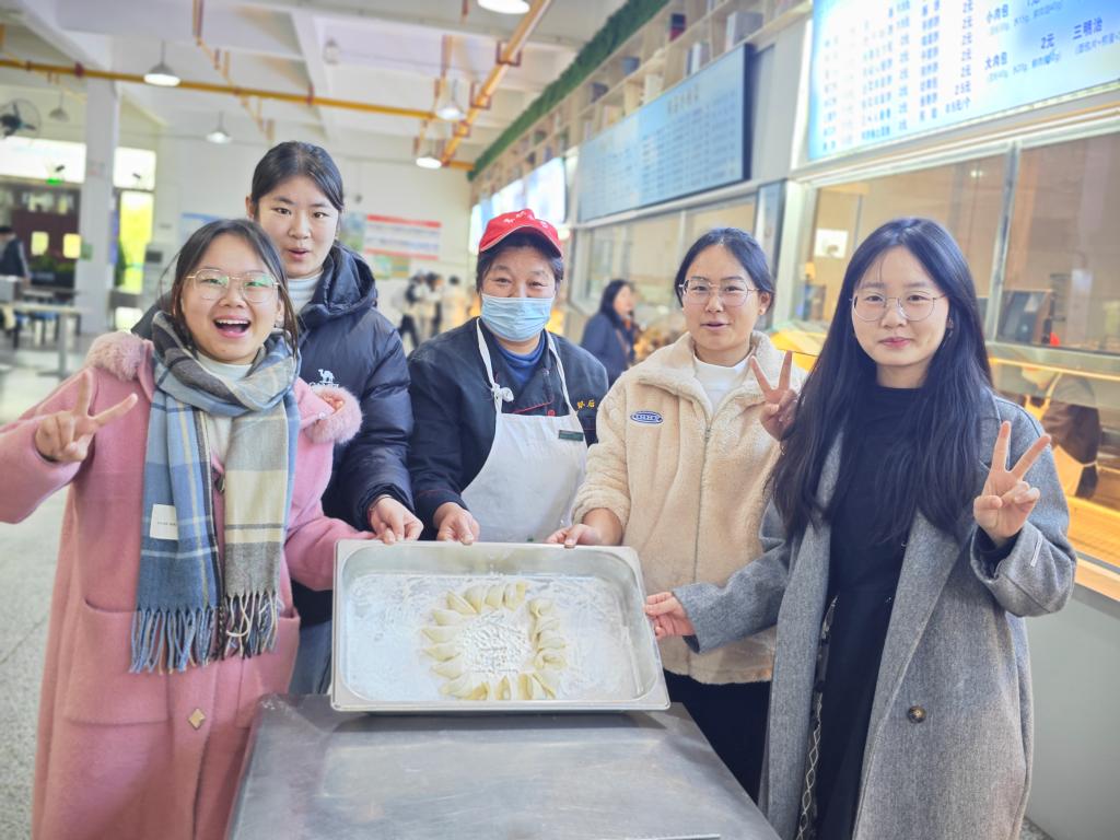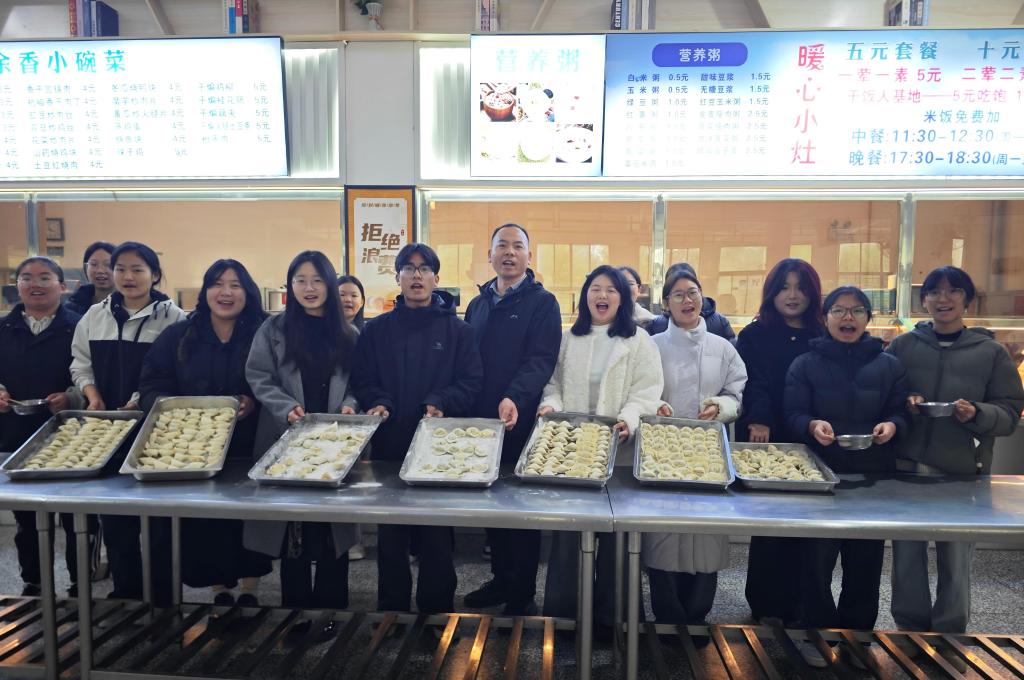 活动中,老师们耐心示范包饺技巧,并与学生亲切交谈,询问学习生活近况。同学们还发挥创意,用包好的饺子拼出“冬至”字样,增添了浓厚的节日氛围。