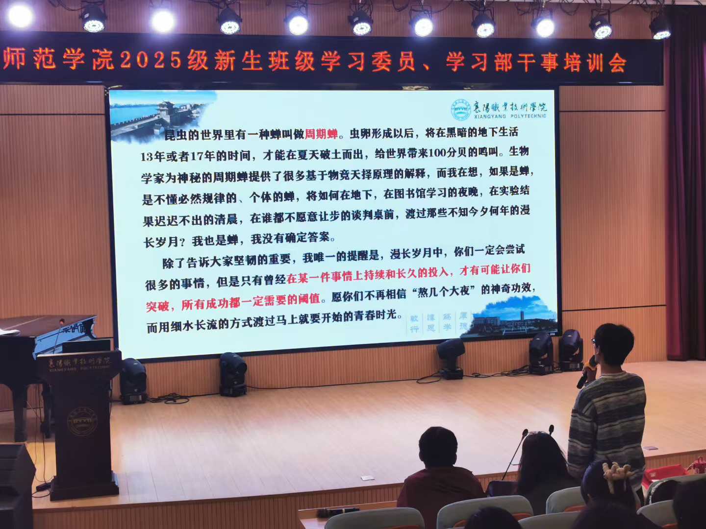 "什么是学习委员?为什么要当学习委员?怎么样做好学习委员?"师范学院教学秘书汤宇开场抛出三个问题叩击学生干部初心使命,现场通过案例分析帮助同学们领悟教学调度员、信息通讯员、学风监督员三重角色内涵。小学教育2305班祁荣娜坦言:"之前认为学委就是收作业的,现在明白我们是师生间的桥梁、学风建设的排头兵。"培训聚焦班级学风建设方法路径,提炼出"三抓三促"工作法:抓课堂考勤促纪律、抓作业质量促学习、抓互助小组促帮扶。教务科现场发布《学习委员工作职责》,明确10项职责清单,让学生干部心中有数。