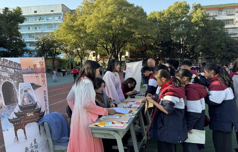“一眼千年共‘襄’古今”古诗词主题游园活动由师范学院千山.雨地文学社、青春同伴社等8个大学生社团联合承办。各社团志愿者将活动现场分成8个主题游园区,专人担任“关卡主理人”,组织小学生们手持闯关卡,有序参与活动。小学生们时而凝神思索,时而脱口而出,清脆的童声与志愿者们的鼓励声交织成最美的校园乐章。