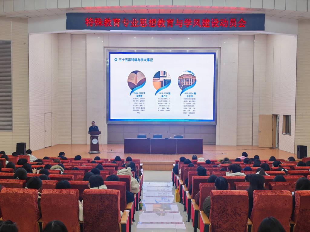 12月28日,师范学院(特殊教育学院)召开"特殊教育专业思想教育与学风建设会",324名特教专业师生齐聚一堂,共同探讨专业发展与学风建设。师范学院(特殊教育学院)党总支成员、各科室负责人、特殊教育专业研究室主任,全体班主任参会。