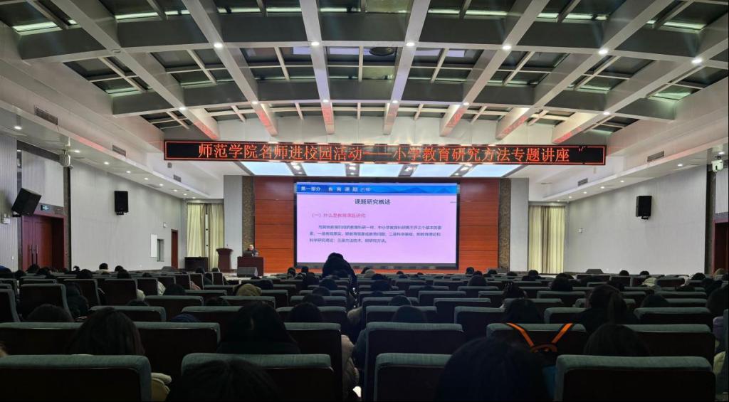 2025年12月12日下午,师范学院特邀襄阳市教科院副书记、副院长郭强教授,面向23级小学教育专业学生及师范学院中青年教师开展“小学教育研究方法”专题讲座。