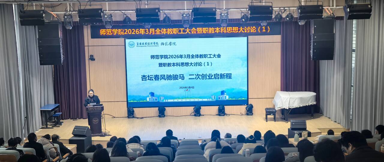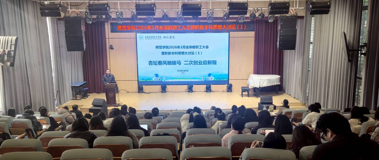 3月4日上午,师范学院(特殊教育学院)在博学楼演播厅召开新学期教职工大会暨职教本科思想大讨论。党总支书记韩景主持会议,全体教职工齐聚一堂,以“杏坛春风驰骏马,二次创业启新程”为主题,共绘职教本科发展蓝图,擂响改革攻坚战鼓。
