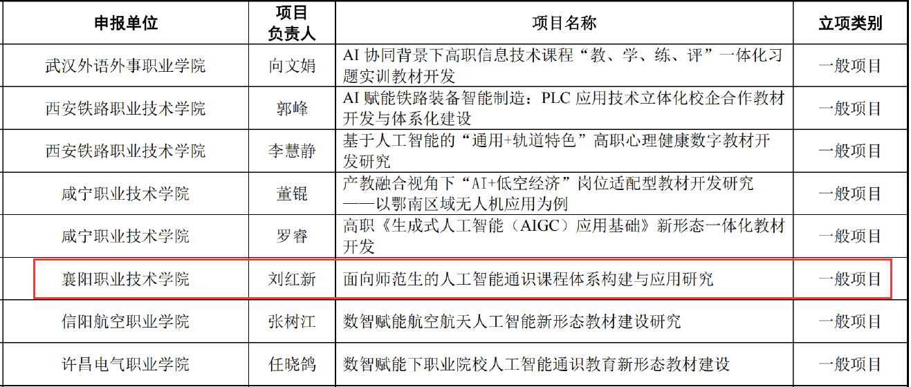 近日,教育部职业院校信息化教学指导委员会正式公示2026年度“人工智能+职业教育智慧教材体系化建设项目”立项结果。襄阳职业技术大学师范学院刘红新教授团队主持申报的“面向师范生的人工智能通识课程体系构建与应用研究”成功获批立项,标志着学校在“人工智能+教师教育”融合领域取得重要突破。
