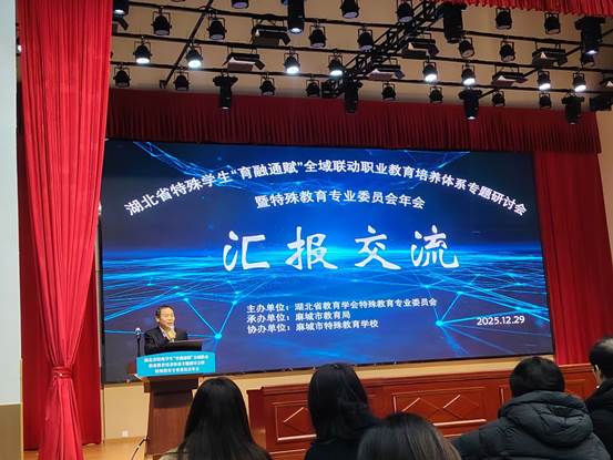 12月28日—30日,湖北省特殊学生“育融通赋”全域联动职业教育培养体系专题研讨会暨特殊教育专业委员会年会在麻城市特殊教育学校召开。本次研讨会由湖北省教育学会特殊教育专业委员会主办,麻城市教育局承办,麻城市特殊教育学校协办。湖北省教育厅基础教育处副处长许彬、湖北省残疾人联合会教就处副处长吴尘,黄冈市教育局党组成员、副局长皮建明,麻城市人民政府副市长张星,麻城市职教集团校长丁升等出席会议。湖北省特殊教育中心办公室主任马仁海受邀参会并主持了汇报交流活动。